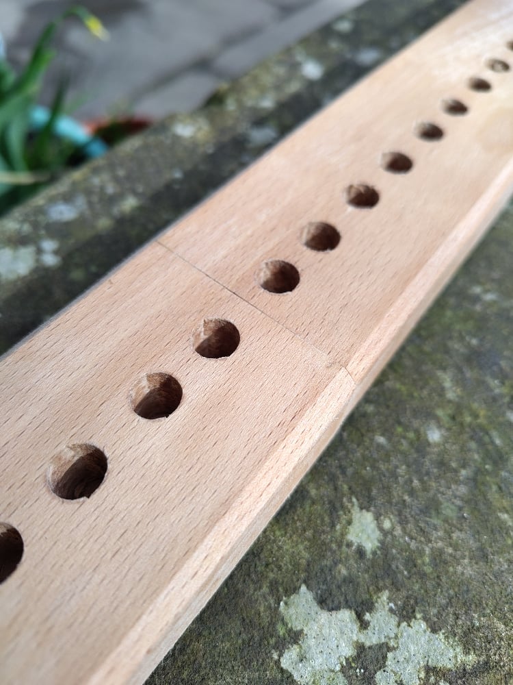 High quality peg looms made in Yorkshire with British hardwood. These looms have one row of peg holes, spaced to allow the loom to be used for chunky weaving using alternate peg holes (35mm spacing), and finer weaving using every peg hole (17.5mm).